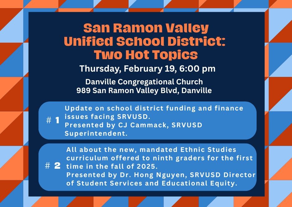 Come to our February Third Thursday Community Program to hear about two important, timely, hot topics affecting the San Ramon Valley Unified School District (SRVUSD). All are welcome to attend what’s sure to be a very interesting evening!